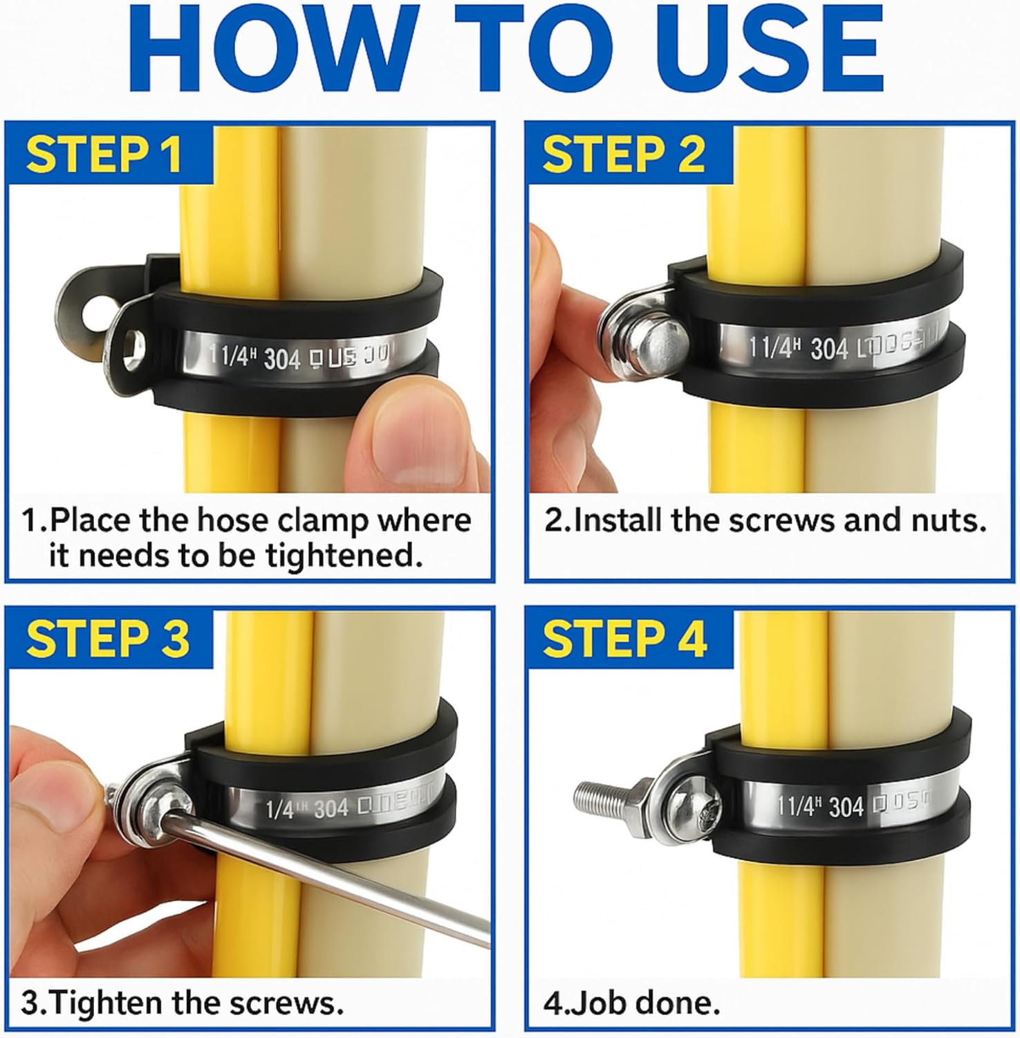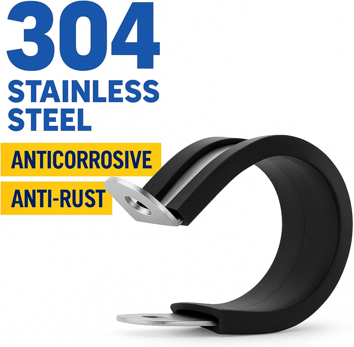 - Rubber‑lined 304 SS P‑clamp shields cables & hoses, reduces abrasion & vibration